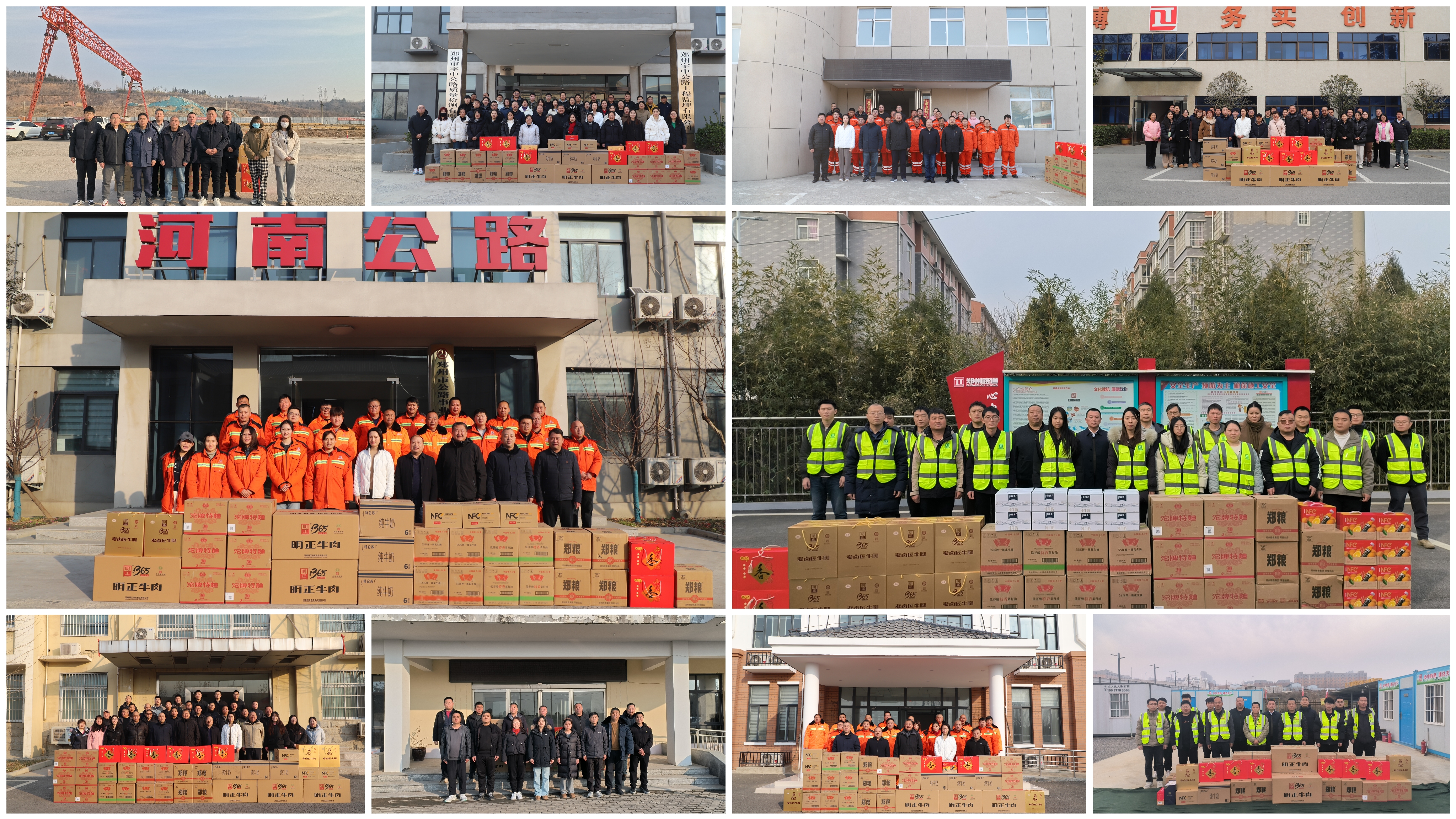 在郭總、秦書記的帶領(lǐng)下,慰問組先后來到滎陽鄉(xiāng)村道路搶險工程、預(yù)制構(gòu)建廠、G310-4標(biāo)段項目部、鄭州商學(xué)院三彩校區(qū)過街天橋項目部、路面鋪筑項目部、三李道班、質(zhì)檢中心、騰盛公司、白沙道班、工程分公司等地,為職工們送上花生油、大米、牛腱、果汁等慰問品。